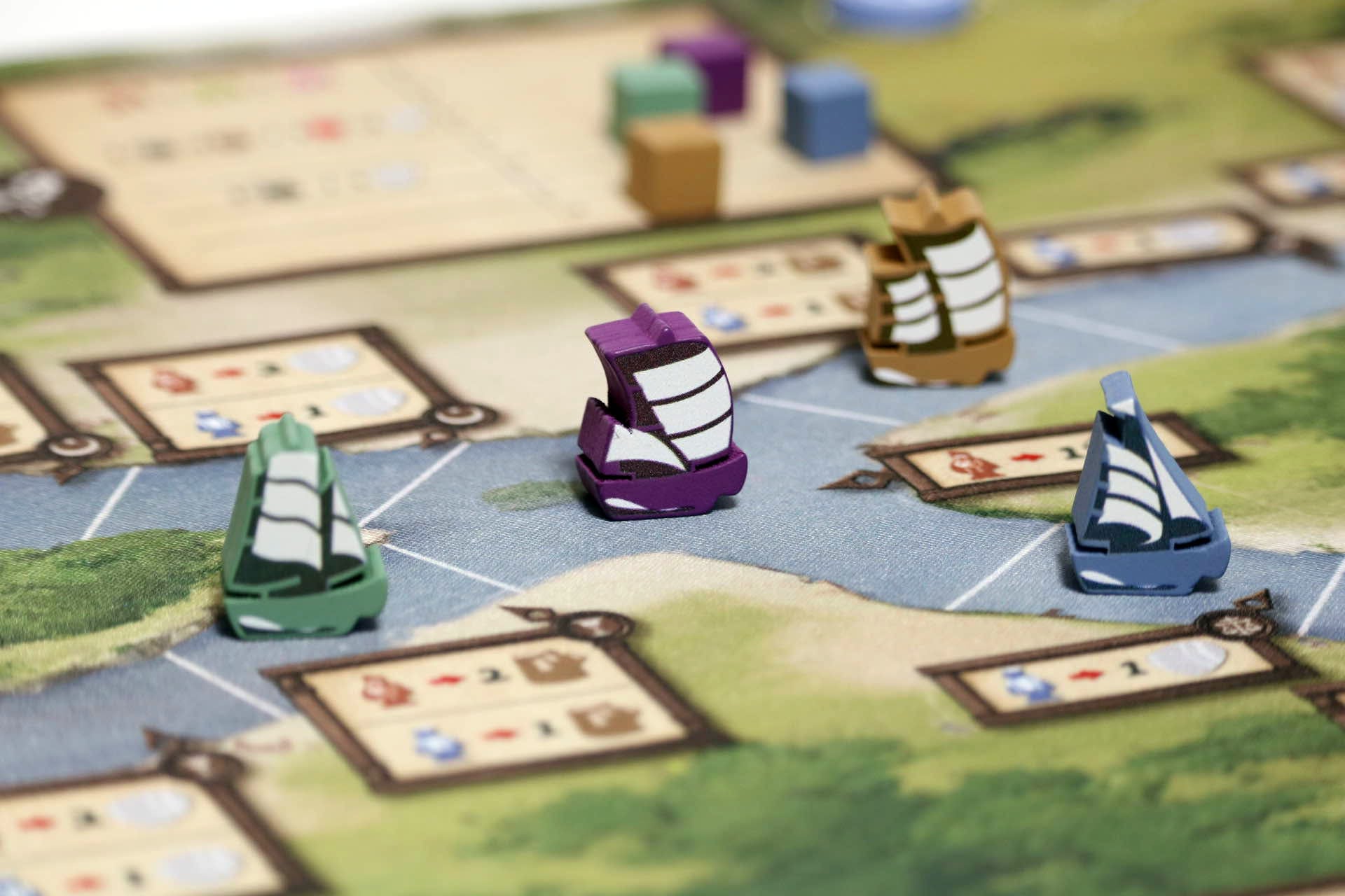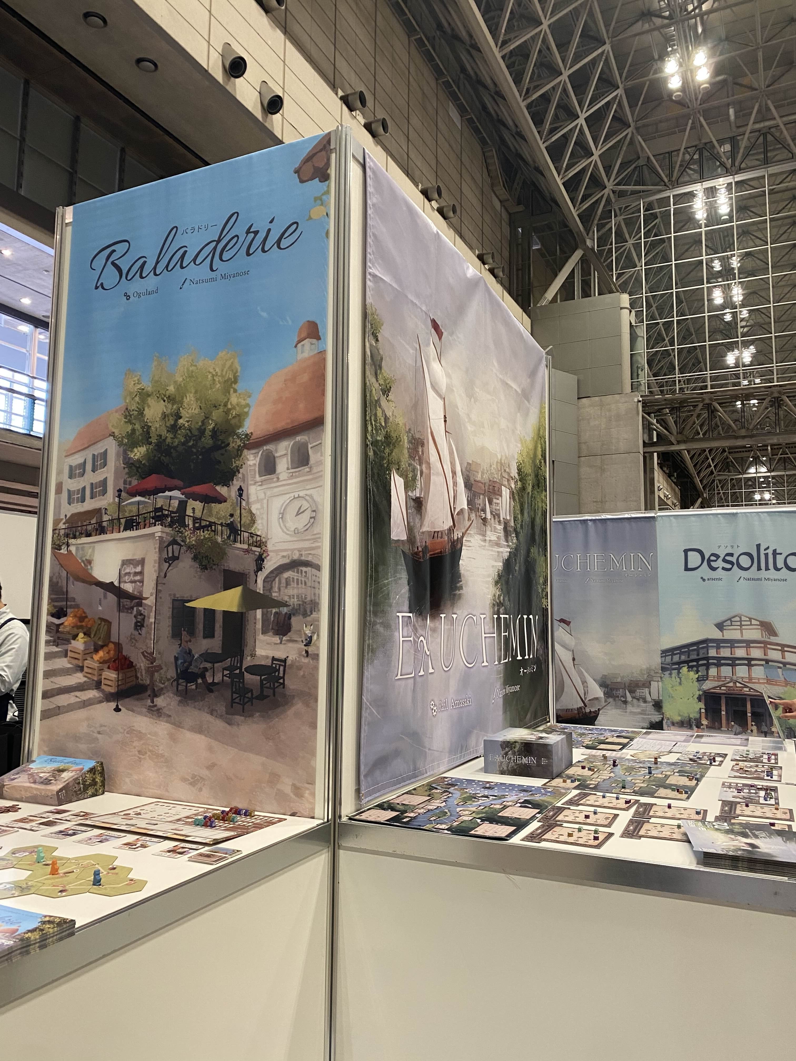 『EAUCHEMIN オーシェミン』 人数:3-4人 プレイ時間:60-80分 ルール説明:30分 ジャンル:ワーカープレイスメント × マジョリティ争い × リソースマネジメント ゲームデザイン:雨崎レール アートワーク:みやのせなつみ グラフィックデザイン:Susan Santosh 校正:うめゆ 出版/編集:Sui Works ========= ●あらすじ フーヌ川が静かに流れるこの街では、全ての物流は船による運搬が欠かせない。 河岸には鉄や石や布など、多岐にわたる産業が息づいていた---。 あなたはこの街の交易会社のリーダーとして、物流の中心で舞台裏の支配者となることを目指します。 あなたは河上から運ばれた資材を河下の街へと運び、街をより豊かにしていきます。 そして、蓄えた富を活用しながら船を強化し、新たな従業員を雇用して、会社を大きく発展させていきます。 しかし、河を渡る競争は手強く、他の会社の勢いも増しています。 あなたは上手に資材を運び、街での優位性を築いて、他社を圧倒し続けることが求められます。 様々な思惑が渦巻く交易の物語が、今始まる。 ========= ●内容物 メインボード 1枚 プレイヤーボード 4枚 街タイル 8枚 街タイルアタッチメント 7枚 マイルストーンカード 9枚 お金チップ 62枚(1金チップ:28枚、3金チップ:20枚、5金チップ:14枚) ワーカーコマ 60個(青:24個、緑/赤/ピンク:各12個ずつ) 資材コマ 60個(鉄材:12個、石材/木材/布材:各16個ずつ) 船コマ 4個(4色1個ずつ) 支店コマ 20個(4色5個ずつ) 推進力マーカー 4個(4色1個ずつ) 積載力マーカー 4個(4色1個ずつ) 労働力マーカー 4個(4色1個ずつ) 達成度マーカー 16個(4色4個ずつ) 影響力トークン 48個(4色12個ずつ) ラウンドマーカー 1個 スタートプレイヤーマーカー 1個 達成度トラックタイル 4枚 スコアパッド 1冊